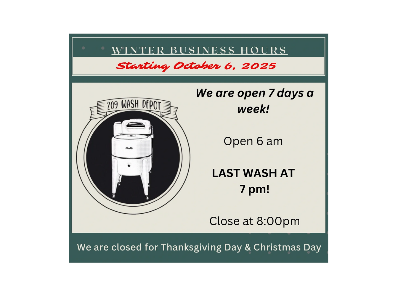 Now Open Winter Hours. Daily from 6 am to 8 pm. LAST WASH at 7 pm